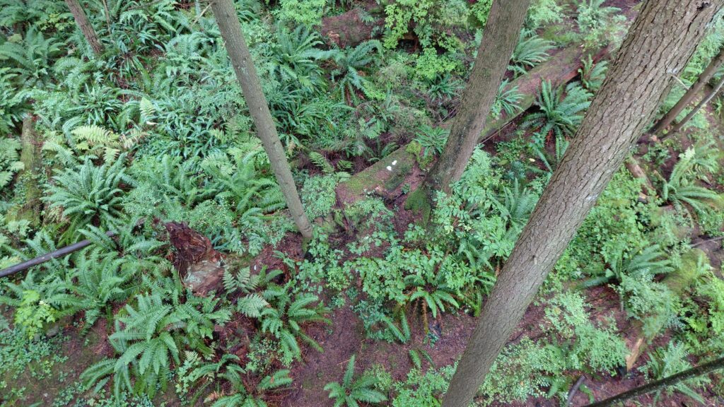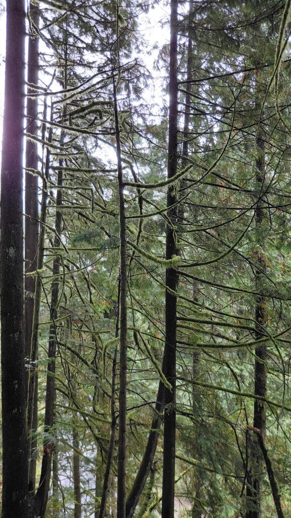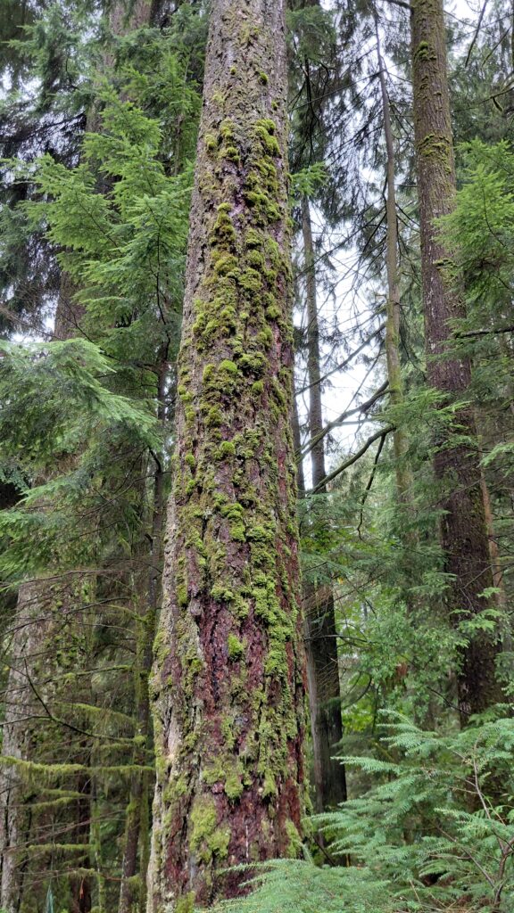 But I’m in a rainforest. Surrounded by 300- 800-year-old Douglas firs, Western red cedars, hemlock, and half a dozen wild-looking maple varieties I’ve never heard of. Rotting wood feeds thickets of ferns. Everything is being consumed by moss. It’s downright Jurassic.